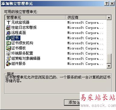 3.點擊“添加”,選擇“證書”,點擊“添加”: