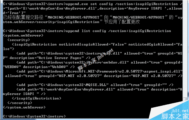 appcmd.exe set config /section:isapiCgiRestriction /+"[path='E:/work/AnyCom/Exe/AnyServer.dll',description='AnyServer ISAPI',allowed='True']"
