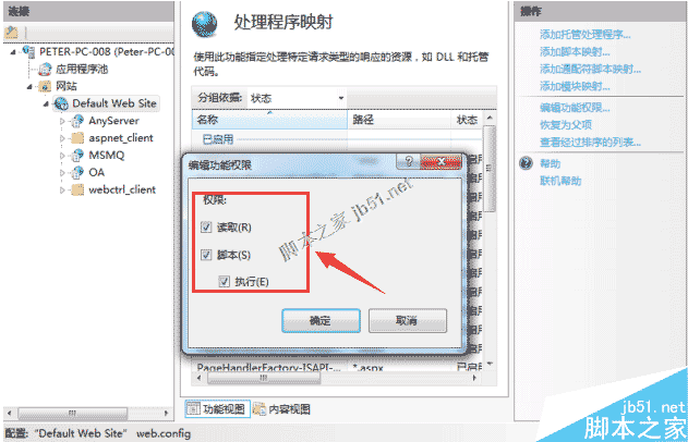 雙擊“處理程序映射”功能,然后點擊“編輯功能權限”,在出現的編輯窗口選擇執行: