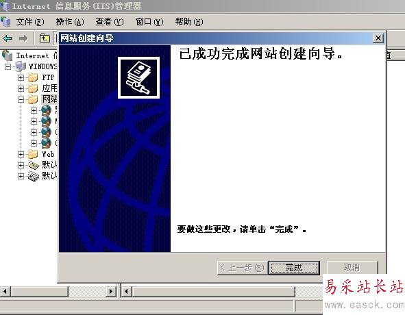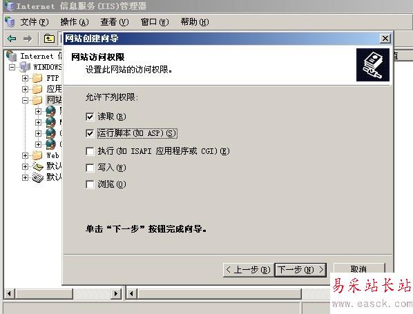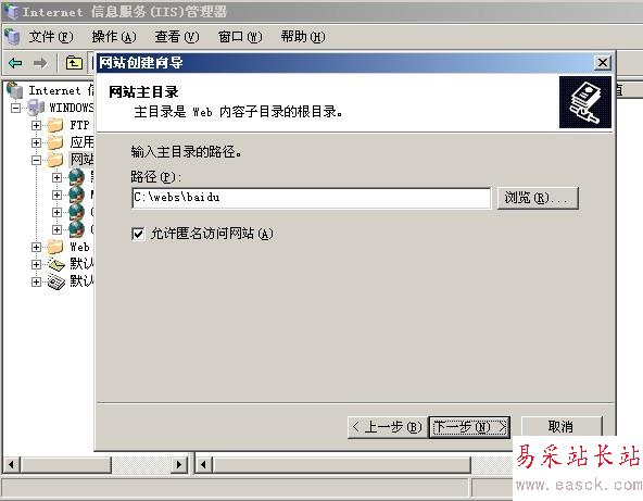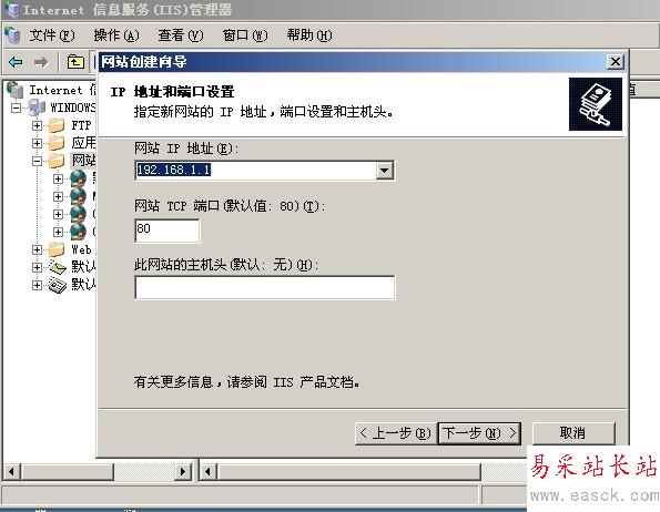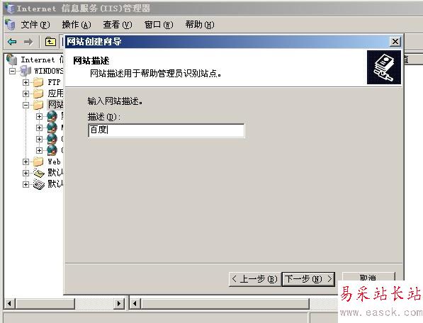 雙擊我們的iis服務器,在Internet信息服務(IIS)管理器左側找到網站的文件夾,然后點擊右擊,新建->網站,在彈出來的網站創建向導中下一步,在網站描述中輸入百度,下一步,網站的IP地址,選擇網卡的IP地址,我這里是192.168.1.1,端口默認還是80,下一步,路徑選擇我們剛剛新建百度的文件夾下面,下一步,先勾選讀取,運行腳本這兩個先把,下一步,就可以看到完成創建網站向導了。