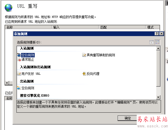 第三步:雙擊“URL重寫”,在右邊窗體中選擇“添加規(guī)則”,并添加一個空白規(guī)則,如下所示: