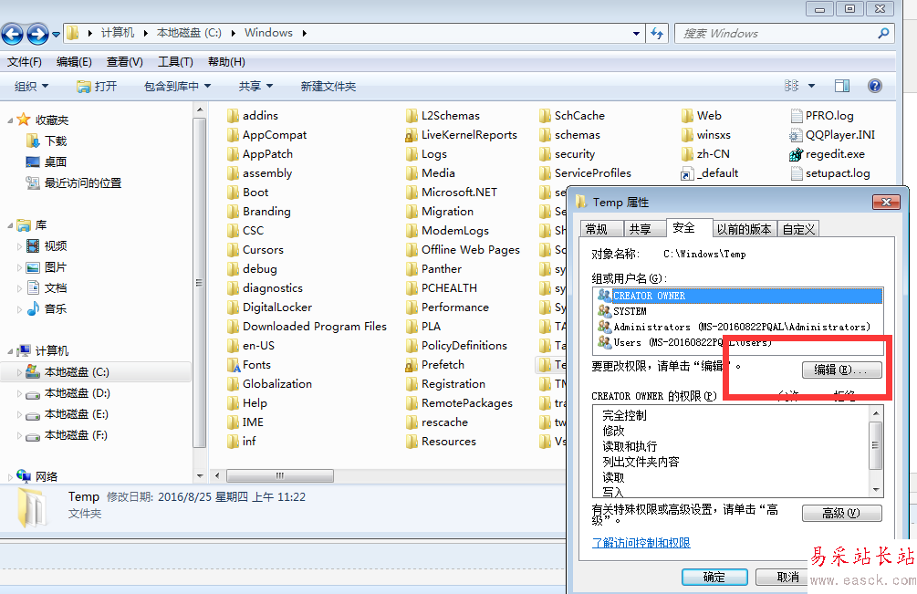 10、改變其權限,找到C盤windos->Temp右鍵->安全【編輯】->添加用戶IIS_IUSER添加完全控制權限即可。-----------------------------經過實驗這一步尤其重要。