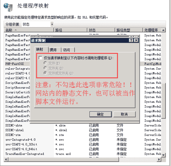 在IIS里找到“處理程序映射”,然后對PHP這一項進行編輯,點擊“請求限制”,把“僅當請求映射至以下內容時才調用處理程序”這個選項勾上即可;