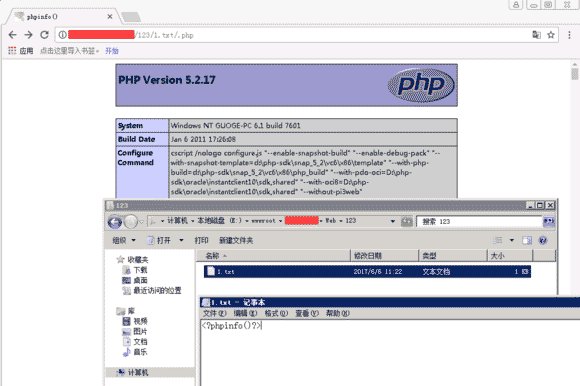 可以看到1.gif里的php代碼被iis解析執行了。 那么“黑客”在具體攻擊網站的時候,先可以通過網站提供的圖片上傳功能(也可以是其他的手段)上傳一個包含了惡意PHP代碼的圖片文件。然后通過上面描敘方法,讓iis解析執行任意惡意的php代碼,控制網站及主機,最終導致網站被“脫庫”、“掛馬”、“植入非法seo鏈接”等等嚴重后果。