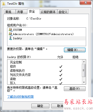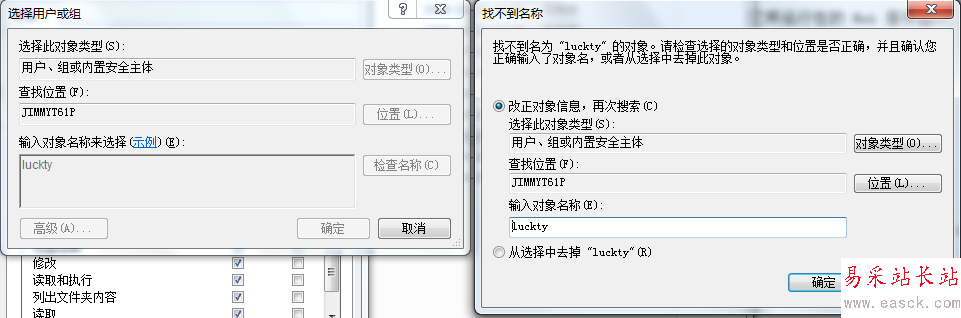 言歸正傳,要想讓那一行測試代碼正常運行,解決辦法很簡單,把虛擬帳號的權(quán)限加入文件夾安全權(quán)限中即可,但是問題來了:這個虛擬帳號我們是不可見的,如果你直接添加名為luckty的用戶到文件夾安全帳號里,根本通不過(提示找不到luckty用戶),說明這個虛擬帳號名稱并不是"luckty"