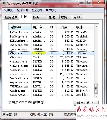w3wp.exe即iis進程,上圖中高亮部分表明該iis進程正在以帳號luckty運行(注意這里的luckty即為上圖中的應(yīng)用程序池名稱)