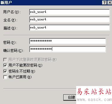 添加用戶大家應該都會吧!寫入用戶名,筆者為了方便,便設置成了web_user4,這個名字不作限制,但設置的密碼要記下來,后面還要用到,順便勾上用戶不能改密碼,還有不過期,這樣后面會省掉一些麻煩。如圖: