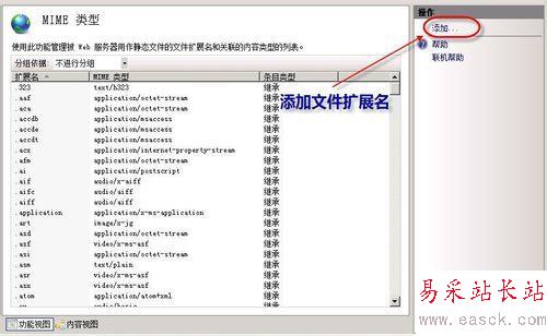 2.“MIME類(lèi)型”功能用來(lái)配置服務(wù)器可以當(dāng)靜態(tài)文件的文件類(lèi)型和與之相關(guān)聯(lián)的應(yīng)用程序。文件類(lèi)型列表按a-z的字母順序排序,點(diǎn)擊“添加”進(jìn)行新的文件類(lèi)型rmvb擴(kuò)展名的添加。