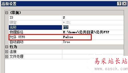 在FTP管理器的右邊點擊“高級設(shè)置”--將“允許UTF8”改為【False】,如下圖: