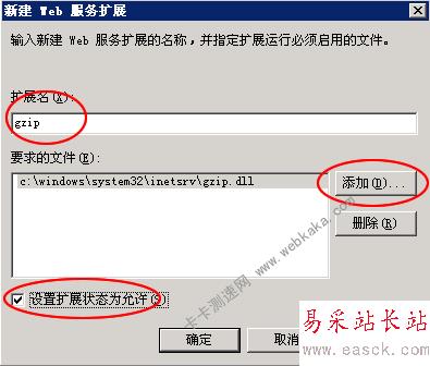 2)、在彈出窗口里寫上“擴展名”(名字隨便無所謂),點擊“添加”按鈕,選擇文件:c:/windows/system32/inetsrv/gzip.dll,然后把勾選“設置擴展狀態為運行”,最后點擊“確定”按鈕。