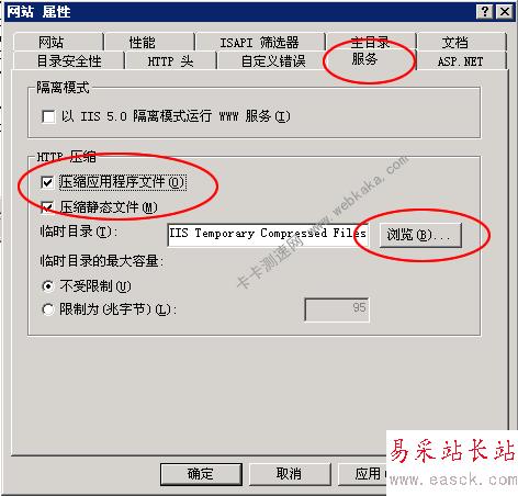 2、在打開的窗口里,切換到“服務”標簽,然后選中“HTTP壓縮”下面的兩個選項,臨時目錄可以自己新建一個目錄(這個目錄必須可寫),也可以不用改它,使用系統默認的路徑:%windir%/IIS Temporary Compressed Files。然后點擊“確定”按鈕。