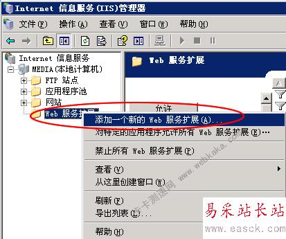 1)、右鍵點擊“Web 服務器擴展”,選擇“添加一個新的Web服務擴展”