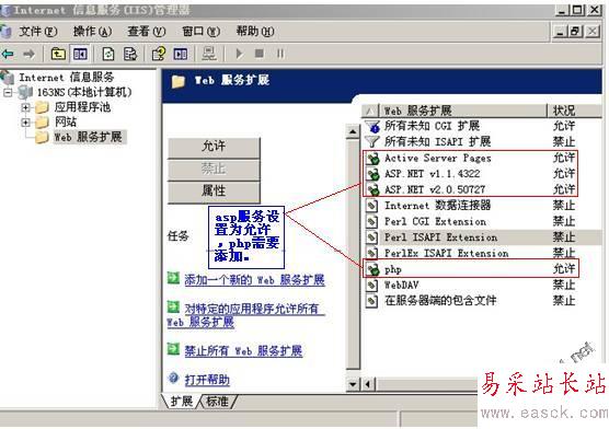 1. 同其它windows平臺(tái)一樣,此時(shí)默認(rèn)Web站點(diǎn)已經(jīng)啟動(dòng)了。但請(qǐng)大家注意,IIS 6.0最初安裝完成只支持靜態(tài)內(nèi)容(即不能正常顯示基于A(yíng)SP的網(wǎng)頁(yè)內(nèi)容),因此首先要做的就是打開(kāi)其動(dòng)態(tài)內(nèi)容支持功能。依次選擇“開(kāi)始-“程序-“管理工具-inter信息服務(wù)管理器”,在打開(kāi)的IIS管理窗口左面點(diǎn)“web服務(wù)擴(kuò)展”,如圖2所示,將鼠標(biāo)所在的項(xiàng)“ASP.NET v.1.1.4322”以及“Active Server Pages”項(xiàng)啟用(點(diǎn)允許)即可。此外安裝asp.net2.0,php以及cgi的配置等等,就不在這里詳細(xì)講解了。