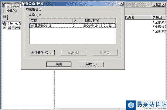 原來的備份(如"黃迎2004415")就會出現在列表框里。點擊[還原]按鈕,系統會彈出詢問窗口,提示用戶"還原是一項耗時的操作(這是為了防止有兩個用戶同時在恢復網站,就你是數據庫的鎖功能),它將覆蓋所有當前的設置并導致全部服務的停止和重新啟動,您確定要繼續嗎?"。點擊[是]進行IIS配置的恢復。在點擊[是]按鈕之后,系統會把當前IIS中所有的配置刪除,把原來備份的配置恢復過來,這個過程要看IIS本身站點配置的數量而定,一兩分鐘就可以完成了。如果你做了N個虛擬站點和FTP,那就另當別論了,此外,雖然系統可以保存多個備份文件,但是每個備份恢復之后,就會覆蓋以前的配置,千萬要注意保證你要恢復的配置操作的準確性呀!最好像我一樣,每次做備份的文件取名為日期,不過名字不能含有破折號,取名的時候要注意名字書寫規則。