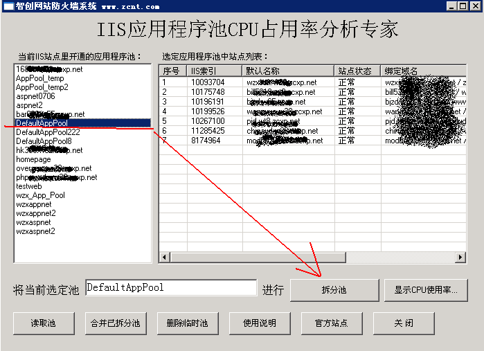點有問題的應用程序池,然后右邊列出這個池中的站點,點“拆分池”