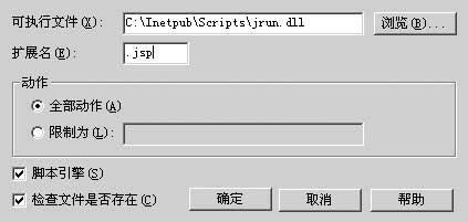 其中可執行文件就是在第二步中對jrrn的iis config設置的路徑,點擊確定后,我們對jrun和iis的配置就全部完成了.下一步就是在iis中建立一個虛擬目錄(此目錄是用來存放jsp文件的)來測式一下我們剛才的設置,把一個jsp文件放在該目錄中,并設置好文檔選項,關閉iis或者重啟iis后,打開ie瀏覽器,在地址欄中輸入 http://localhost ,回車后你便會發現瀏覽器正在顯示你做的jsp文件的效果.終于大功告成了.