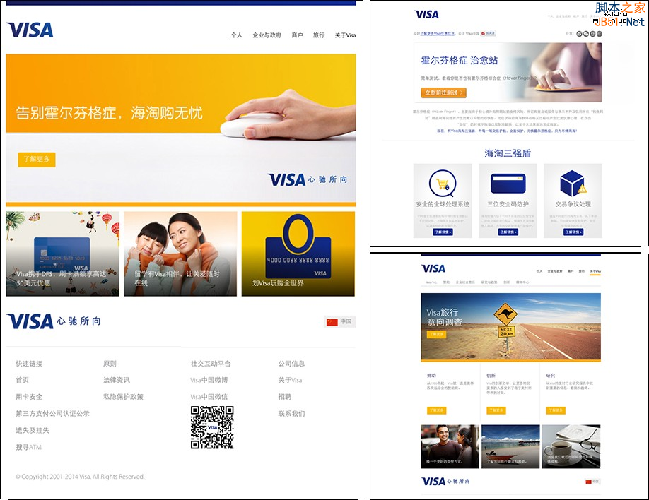 VISA是一個信用卡品牌, 深藍色傳達和平安全的品牌形象,黃色能讓用戶產生興奮幸福感。另外藍色降低明度后再和黃色搭配,對比鮮明之余還能緩和視覺疲勞。