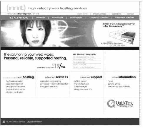 區塊編排,是以顏色或線條,來劃分一些區域的編排方式,其實也就是分欄結構的變異。如果說分欄設計太過規范沒有新意的話,那么就要看看區塊功用了。如左圖所示:這樣的設計,很漂亮,不過也要依據內容許可程度,國外用此類設計手法的很多,色彩運用上也很出色(以后在本系列中會提到一些色彩問題)。區域編排的設計,一般和豎分欄不同的是,頁面一般情況下不長,一屏或一屏半左右的長度,用于信息量少的企業站點,和專業型站點。還有就是看你是什么內容的個人主頁,大部分情況都很適用。但是卻不適合門戶站點和信息量很大的站點。