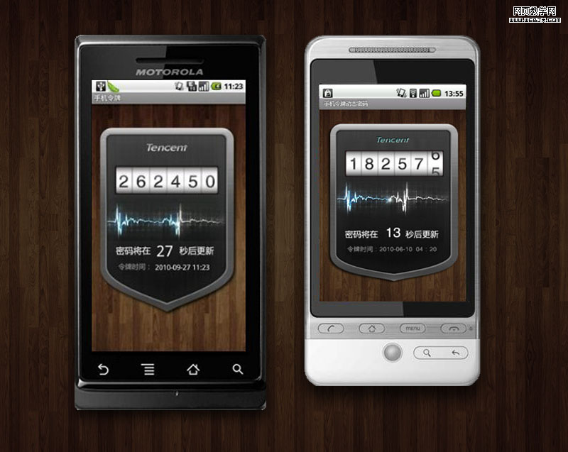 對于令牌主頁面的全擬物風格,如何適應這些不同的分辨率,我們也做了統一適配處理:我們先采用了木材背景填充頁面所有位置,針對不同的分辨率,程序先檢測手機分辨率,然后針對不同的分辨率,將盾牌擺放在不同的高度。當然,高度還要充分考慮到menu鍵呼出option菜單后的效果,大家可以留意下不同手機看到的盾牌距離狀態欄的距離,如下圖所示:
