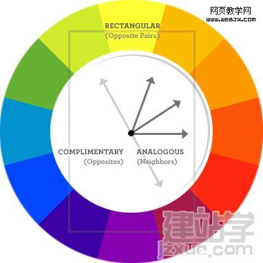 矩形選色法不僅是最復雜的,而且是最難搞懂的。但它的挑顏色卻相當簡單,只需畫一個一個長方形的撐住色相環;這樣,矩形的四個角就會各壓住一個色相。然而,重點是變化。一不小心,你的方案會花得堪比彩虹。盡量讓一種顏色壓住別的,并且讓您的用色方案盡可能簡明。我發現如果多種顏色相對不飽和,那么處理起來就會容易許多。