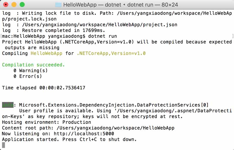 新建了應用程序之后,使用dotnet restore 和 dotnet run 命令來測試一下我們的應用程序。