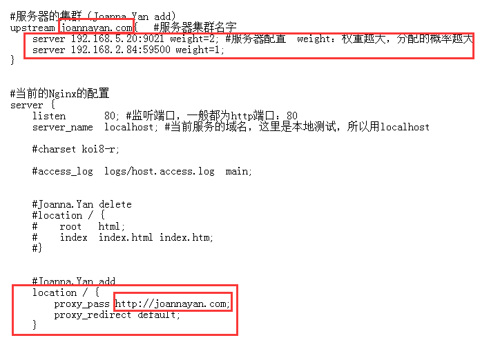 location / {} :對什么樣的后綴進行負載均衡請求,假如我們要對所有的aspx后綴的文件進行負載均衡時,可以這樣寫:location ~.*/.aspx${} proxy_pass:請求轉向自定義的服務器列表,這里我們將請求都轉向標識為http://joannayan.com的負載均衡服務器列表。 weight權重,權值越高被分配的幾率越大。可以根據機器配置定義權重(如果某臺服務器的硬件配置很好,可以處理更多的請求,那么可以為其設置一個較高的weight;而有一臺的服務器的硬件配置比較差,那么可以將前一臺的weight配置為weight=2,后一臺差的配置為weight=1)。測試