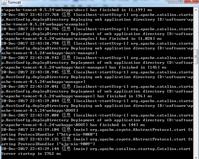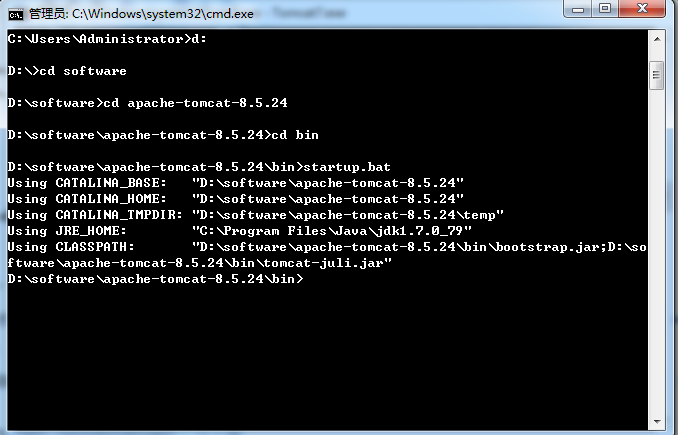 然后啟動兩個tomcat,在啟動前,先更改其中一個的端口號,使得兩個tomcat啟動時不會端口沖突,一個是本身的8080端口,一個是改成了9080端口。配好以后,打開cmd命令窗口,我的tomcat一個放在D:/software/apache-tomcat-8.5.24目錄下,按照如下命令即可啟動,啟動成功會彈出另一個窗口,顯示如下: