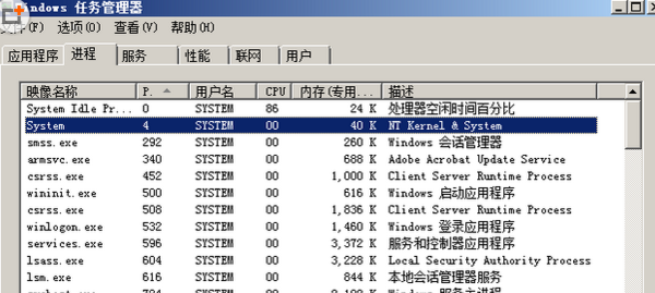 netstat -aon|findstr “:80″這時,我們并沒有看到本機有被PID為4的進程占用,在任務管理器里找到了它,