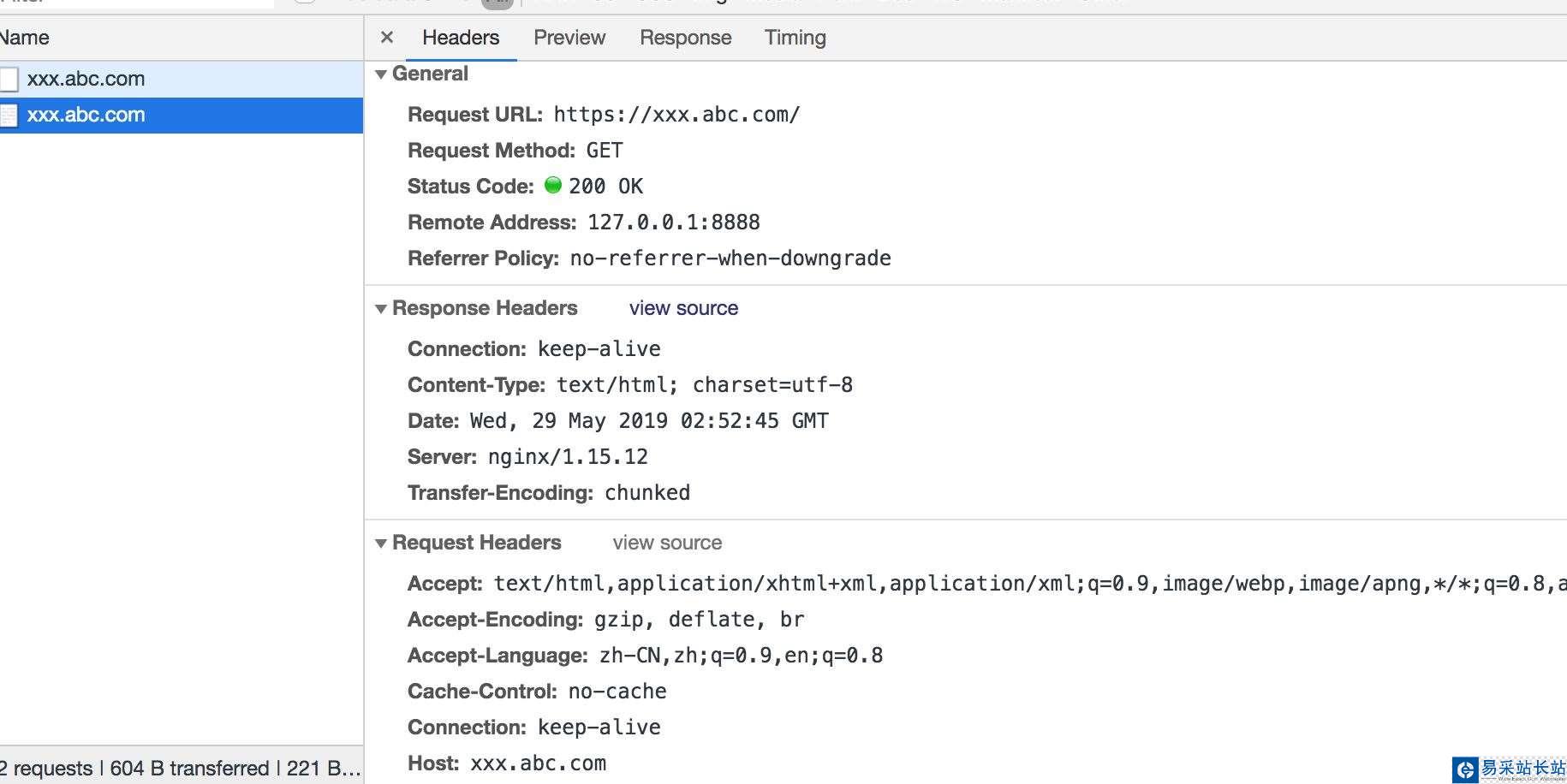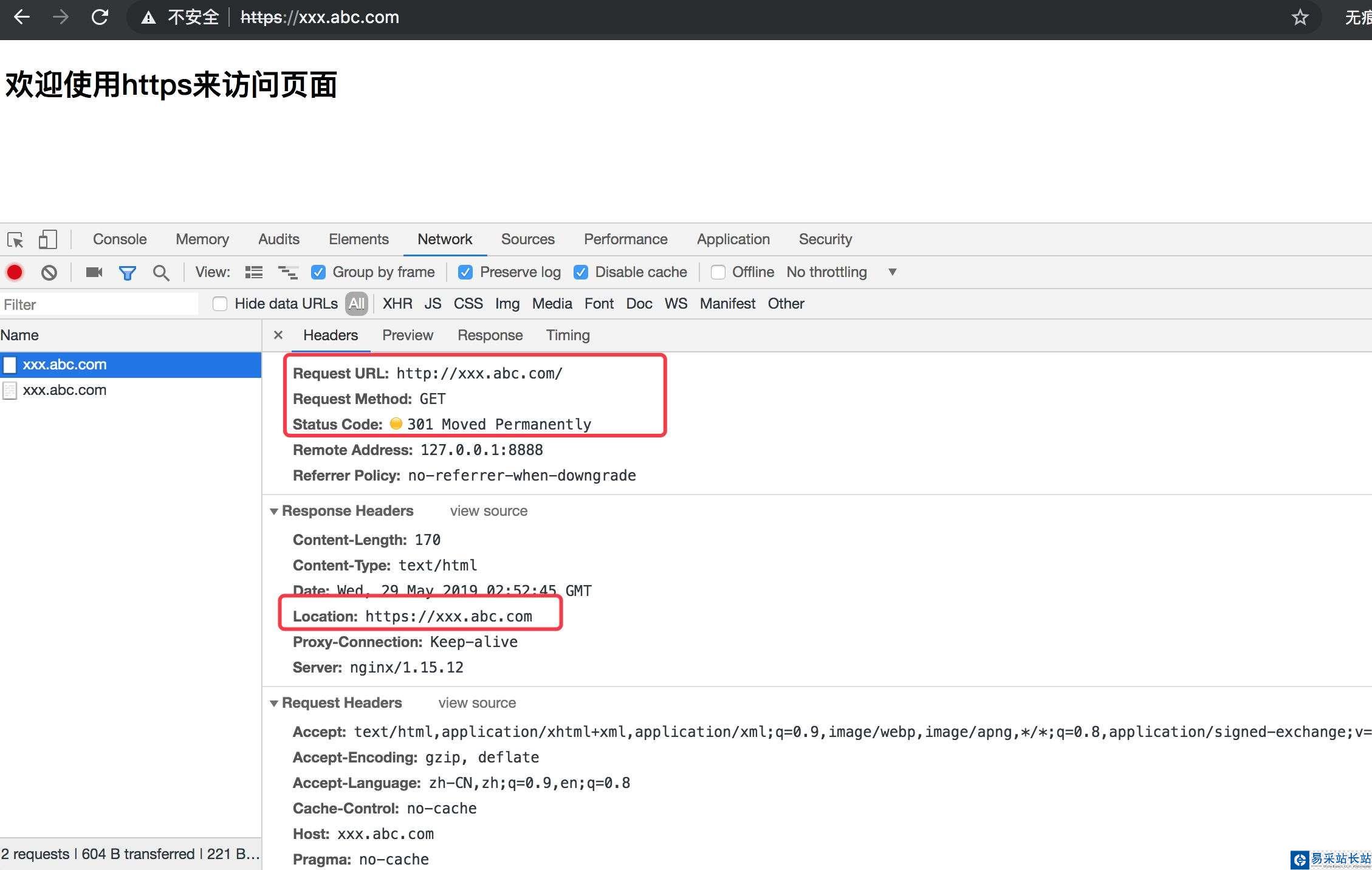 如上配置后,我們需要重新啟動下nginx即可生效,我們在瀏覽器下輸入域名 http://xxx.abc.com 后 會自動重定向到 https://xxx.abc.com/ 了,我們再來看下 我們網絡上的請求有2個請求,如下所示: