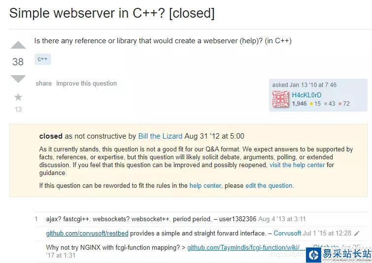 對于一個C++新手,前期調研當然是先進行搜索,http server c++搜處理的結果也是五花八門,有的是教你如何通過實現一個http服務器,有的是一個用第三方庫,有的是直接懟一堆代碼。。。知道在stackoverflow上看到了: