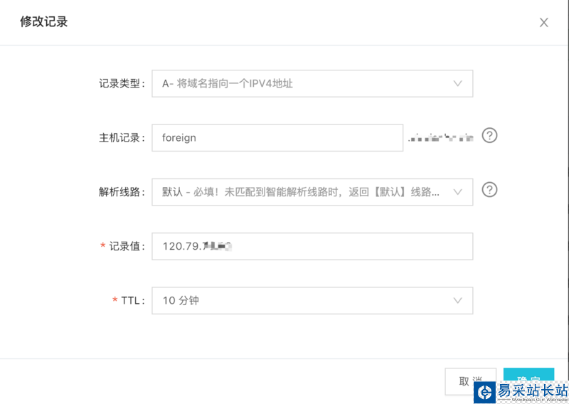 筆者使用的阿里云,登錄到阿里云后臺(tái)后,新增A記錄,將三級(jí)域名名稱填入到主機(jī)記錄中,具體填寫方法可以參考下圖