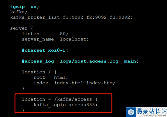 #添加配置(2處)kafka;kafka_broker_list f1:9092 f2:9092 f3:9092;location = /kafka/access {kafka_topic access888;}