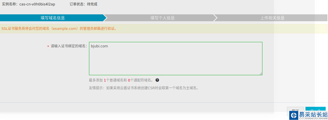 說明:因為我們這里申請的是開發版免費證書,所以一個證書僅支持一個域名認證,不支持通配符。