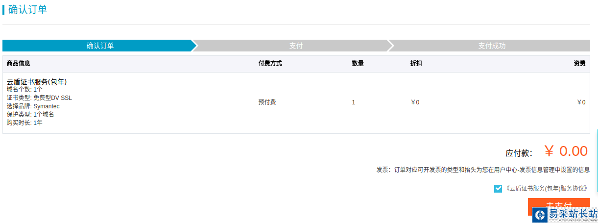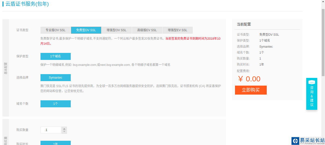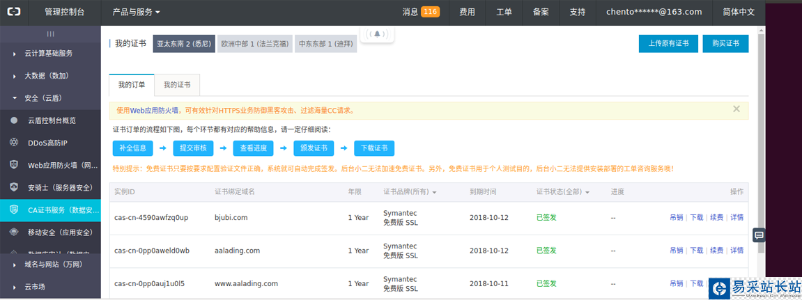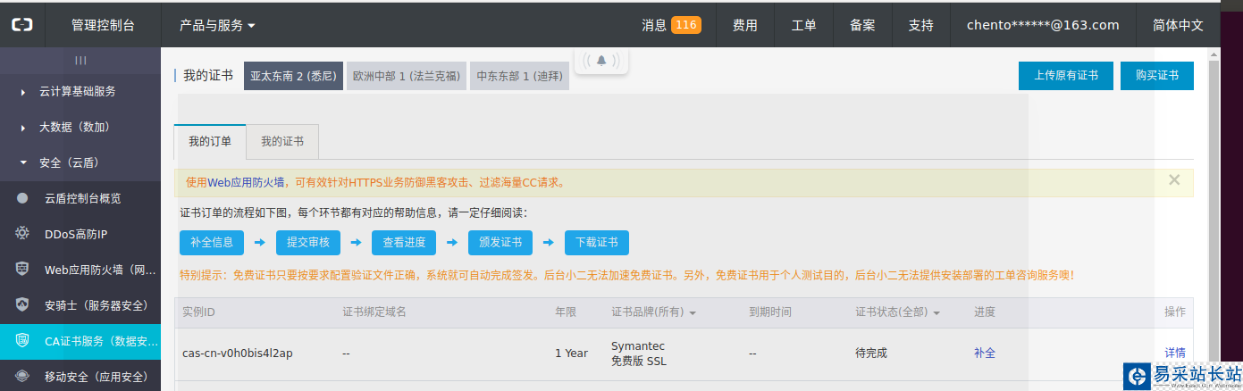 在阿里云控制臺-產品與服務-安全(云盾)-CA證書服務(數據安全),點擊購買證書,