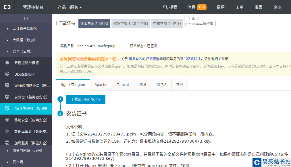 進入下載頁面,找到ngin頁簽中nginx配置信息,并“下載證書 for Nginx”: