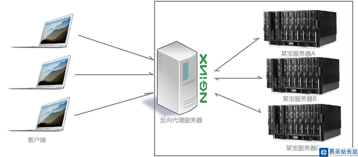 通過上述的圖解大家就可以看清楚了,多個(gè)客戶端給服務(wù)器發(fā)送的請求,nginx服務(wù)器接收到之后,按照一定的規(guī)則分發(fā)給了后端的業(yè)務(wù)處理服務(wù)器進(jìn)行處理了。此時(shí)~請求的來源也就是客戶端是明確的,但是請求具體由哪臺服務(wù)器處理的并不明確了,nginx扮演的就是一個(gè)反向代理角色