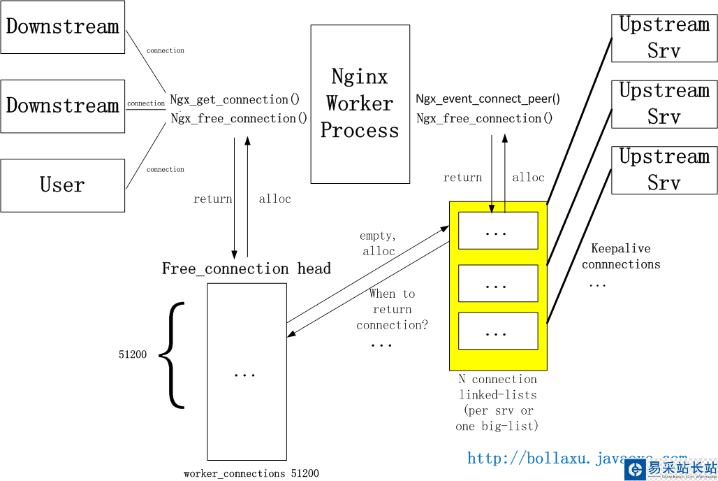 Nginx目前的upstream連接建立和獲取的機制如下圖。Nginx會在一開始創建connection pool(進程間不共享,可以避免鎖),提供給所有向前/后的連接。