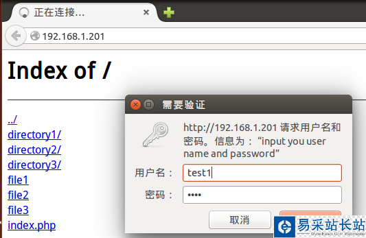 有些目錄不想讓所有人看到,只有指定的用戶輸入密碼后才能訪問,例如directory只能由test1訪問: