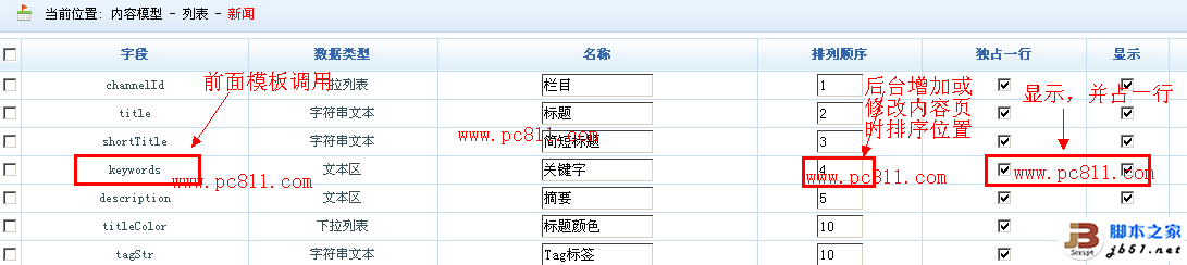 :字段就是前面模板內容頁調用時需要用到的。