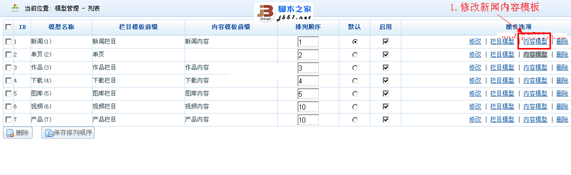 第2步:在模型管理中,找到自己需要修改的模型,并在此行右側單擊“內容模型”連接。操作方法如下圖所示。