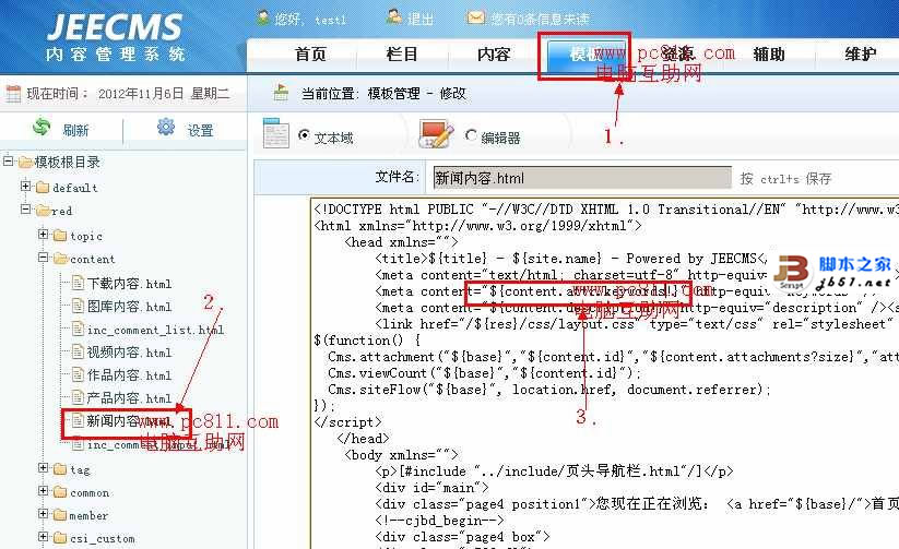 第7步:完成以上步驟之后,我們再回到JEECMS后臺界面,單擊“模板”,并在左側依次打開red>>content>>并在此下面找到新聞內容.html頁面。