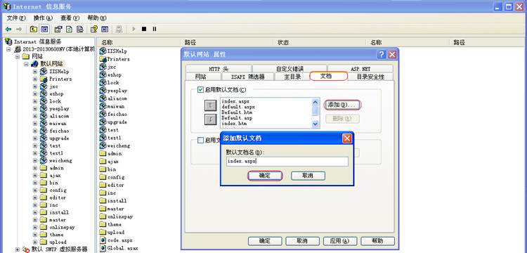 點擊文檔選項卡,添加index.aspx和default.aspx為默認文檔,并移動到頂層。