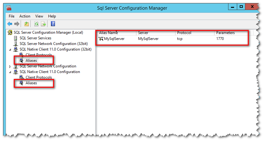 打開Sql Server Configuration Manager,找到Aliases的配置,修改默認的1433端口,據我了解只修改第二個就可以,當然為了避免問題,都修改了也無妨。如下圖: