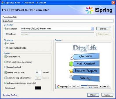 值得一提的是,iSpring旗下還有一個在線PowerPoint分享站點SlideBoom,用戶能夠在這里存儲和分享自己制作的PPT, PPS格式的演示文稿,上傳后SlideBoom會自動將其轉換為Flash。所以,如果你不想安裝任何軟件,還可以使用它進行PPT到Flash的在線轉換,然后下載即可。