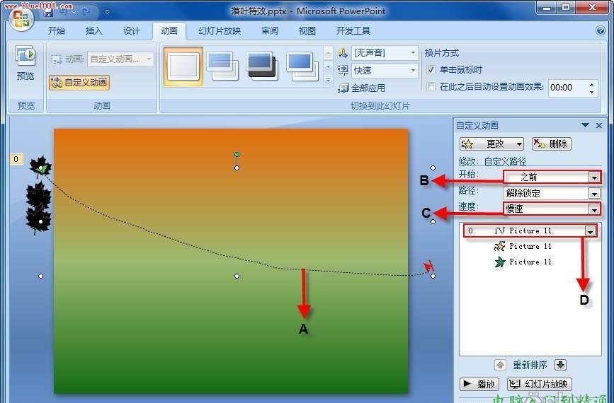 第二步:選中導(dǎo)入到幻燈片預(yù)覽區(qū)域左邊的任意一張PNG格式的樹葉圖片,接著單擊主界面“動(dòng)畫”選項(xiàng)卡中的“自定義動(dòng)畫”按鈕,調(diào)出“自定義動(dòng) 畫”面板;然后單擊該面板中的“添加效果”按鈕,選擇“動(dòng)作路徑→繪制自定義路徑→任意多邊形”并在幻燈片的預(yù)覽窗口中畫出一條軌跡線(如圖2,A處), 為該樹葉圖片添加一個(gè)任意多邊形的動(dòng)畫特效;再將“自定義動(dòng)畫”面板中與該動(dòng)畫有關(guān)的“開始”參數(shù)修改為“之前”,速度參數(shù)修改為“慢速”(如圖2,B、 C處);最后雙擊圖2,D處的動(dòng)畫選項(xiàng),打開“自定義路徑”對(duì)話框的“計(jì)時(shí)”選項(xiàng)卡,將“延遲”參數(shù)修改為1.1秒即可。
