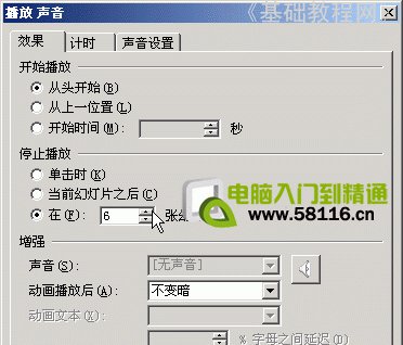 3)在效果選項面板中,單擊中間的停止,選擇“在 6張幻燈片后”,因為演示文稿總共有6張;