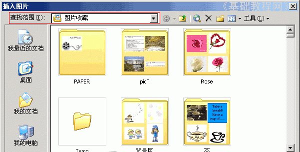 3)出來一個“插入圖片”的對話框,點上邊的“查找范圍”找到自己的圖片文件夾,然后在中間選擇一個圖片,點“插入”即可;