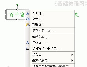 3)再添加三個文本框,里頭分別輸入“百葉窗”、“ 飛入”、“音效”,文字格式為,楷體、24好、綠色,排好位置;
