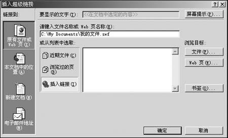 2. 在其中建立任意一個對象(如一段文字、一張圖片等)。選中這個對象,單擊“插入”菜單,在彈出的下拉菜單中單擊“超級鏈接”(以上操作也可以換為“右單擊對象,從彈出的快捷菜單中單擊‘超級鏈接’”),此時會彈出“插入超級鏈接”對話框,系統默認鏈接到的對象是對話框左側上部的“原有文件或Web頁”。單擊右側的“文件”按鈕,在出現的“鏈接到文件”對話框中從“我的文檔”中找到“我的文件”并雙擊,Flash動畫的路徑便自動出現在“插入超級鏈接”對話框中(如圖6),最后單擊“確定”返回PowerPoint。