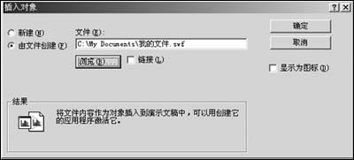 2. 單擊“插入”菜單,在彈出的下拉菜單中單擊“對象”,此時會彈出“插入對象”對話框,選擇“由文件創建”,單擊“瀏覽”,在出現的“瀏覽”對話框中找到“我的文檔”中的“我的文件”并雙擊,Flash動畫的路徑便會出現在“插入對象”對話框中的文本框中(如圖5),最后單擊“確定”返回PowerPoint。
